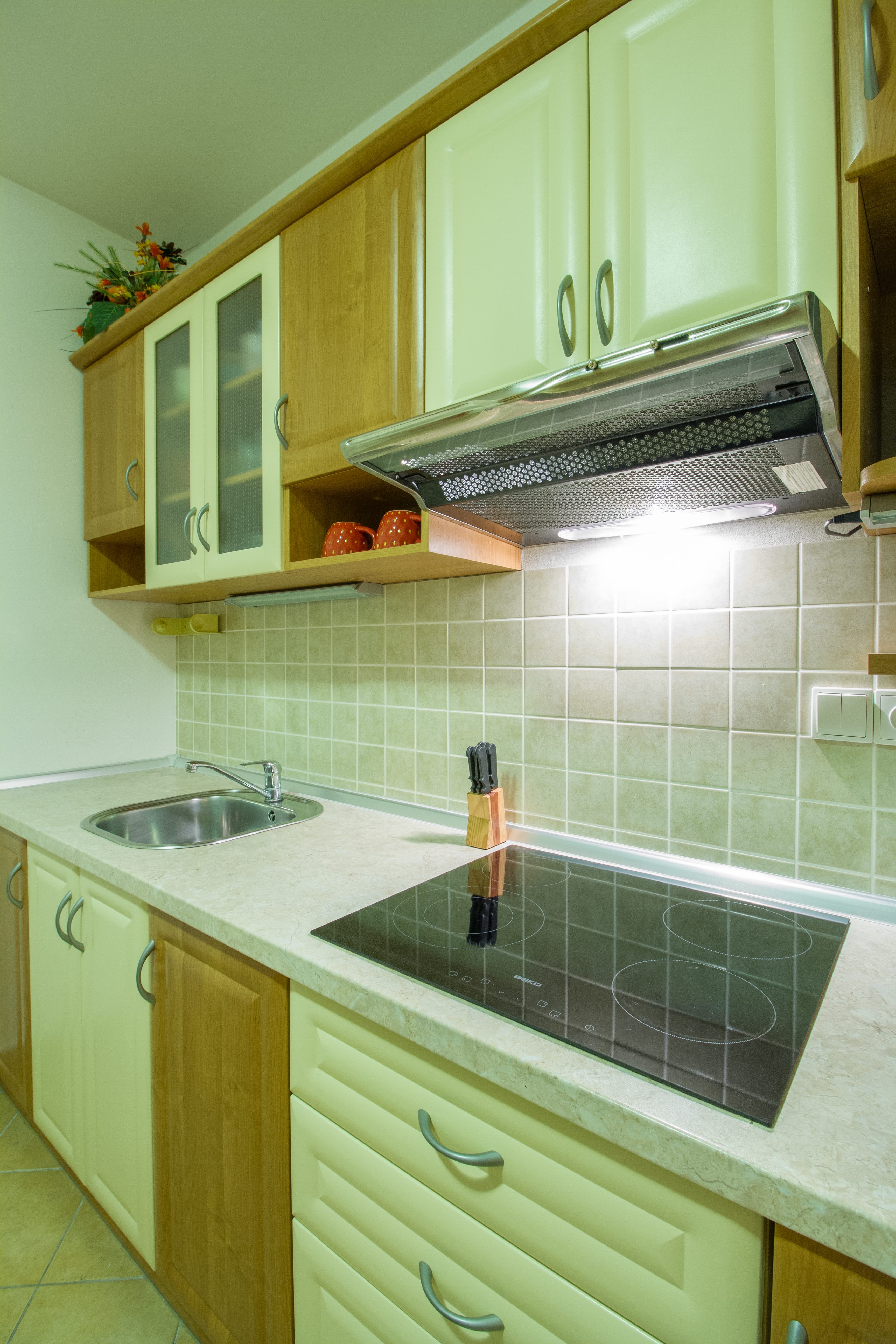 Kuchyňa: kuchynská linka, sklo keramická doska s 4 platňami, mikrovlnná rúra, varná konvica, kávovar na kapsule Tassimo, chladnička s výparníkom.