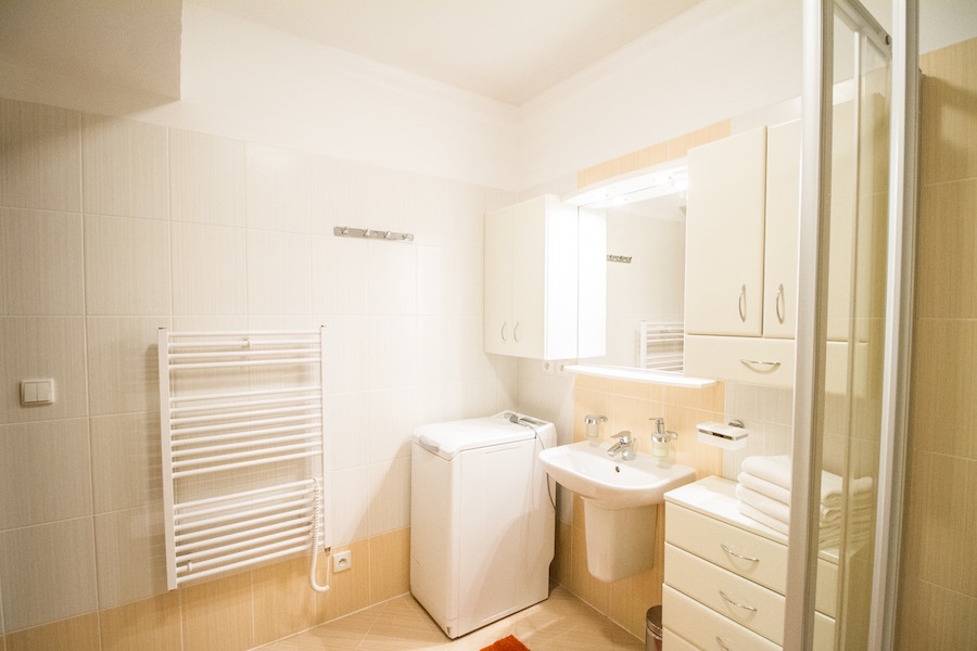 - V kúpelni je podlahové kúrenie a rebríkový radiátor a pračka.